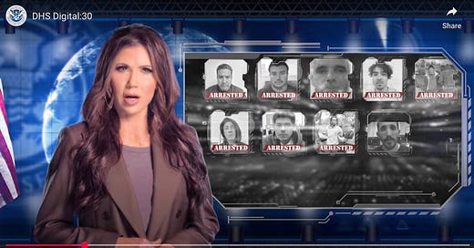 After lauding the detainment of 100,000 people amid a montage of arrests, images of Noem “touring” El Salvador’s CECOT flash across the screen. She then promises deportation and fines of $1,000 a day.