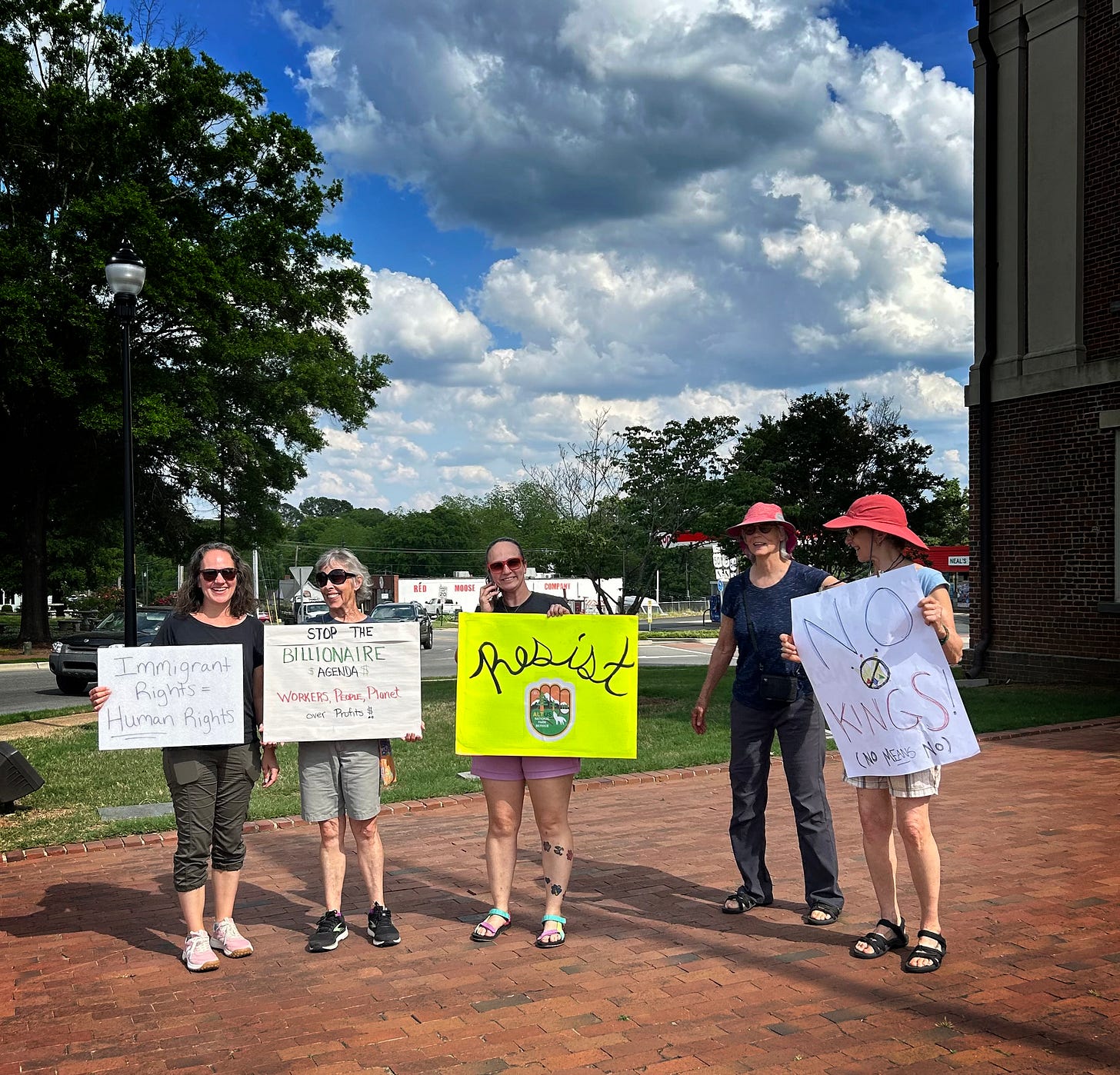 “A friend decided to put out a call on May Day for people to show up to protest that afternoon in the circle around the courthouse in our small town. Eventually 10 people showed up, including one person who was not contacted but saw what we were doing. She carries her sign in her car so she can always join in! So many people honked, waved and thanked us! (Of course there were a few who have us the finger or told us to go home. We wished them a good day).”