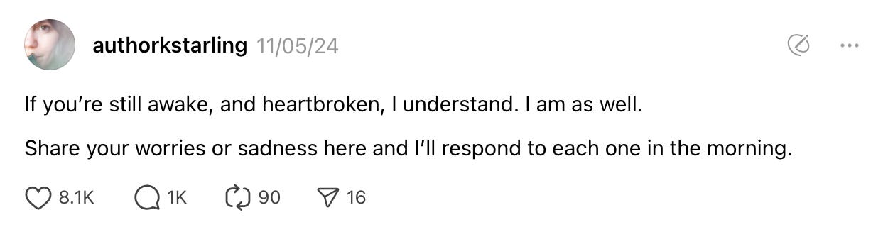 As a resident of the southwest, I had fallen asleep knowing our nation’s fate. Hoping to offer comfort or solidarity, I posted, “If you’re still awake, and heartbroken, I understand. I am as well. Share your worries or sadness here and I’ll respond to each one in the morning.”